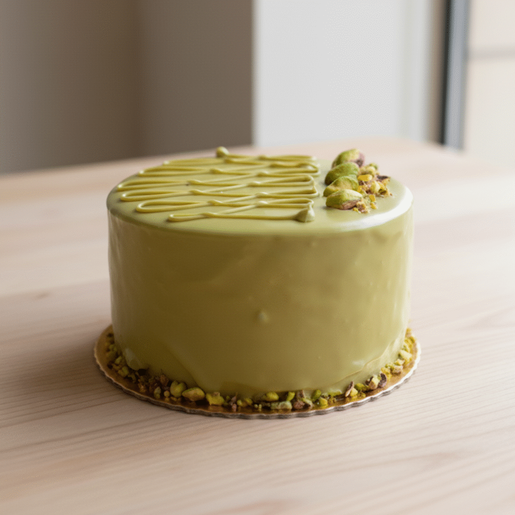 3. Finalize a torta com o chantilly batido, e cubra com 250g do Ganache Pistache. Decore com pistaches inteiros.