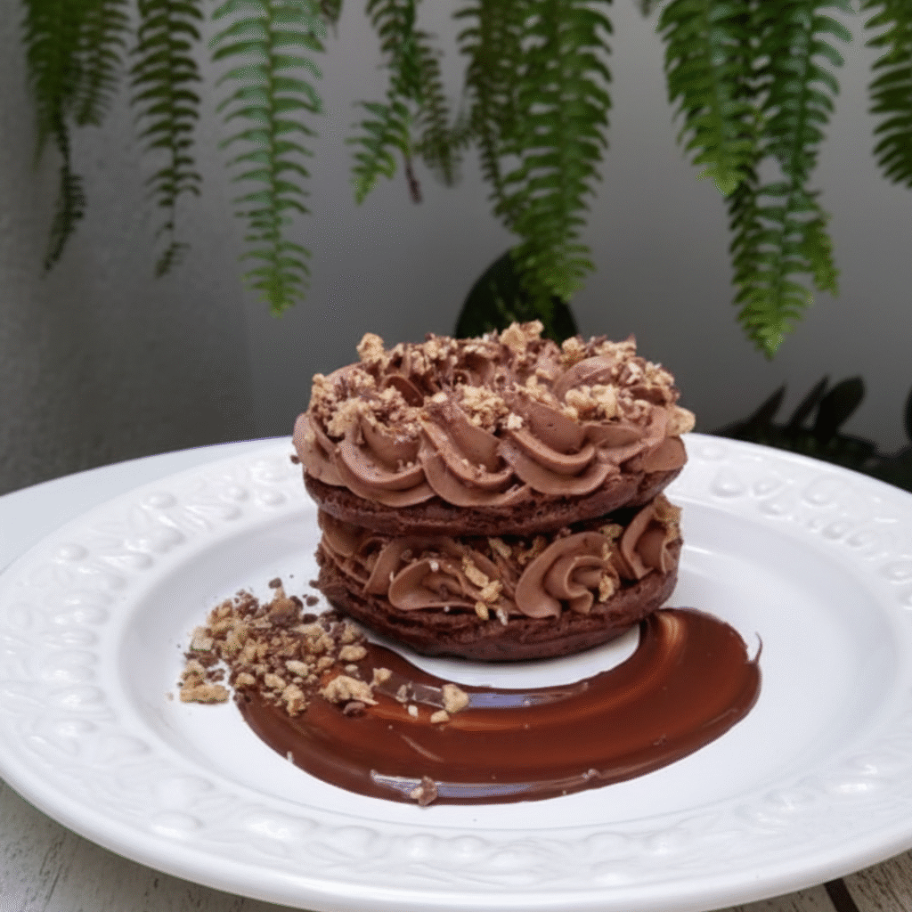 4. Bata o chantily em ponto firme e misture o Ganache de Chocolate e o Mesclado Creme Valsa delicadamente. Aplique o recheio com o auxílio de uma manga de confeiteiro. 5. Decore com o creme e o bombom triturado.