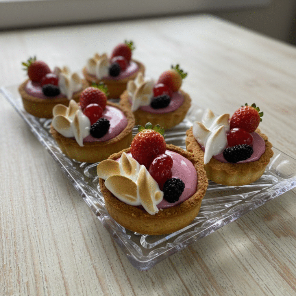 4. Aplique o suspiro com o auxílio de uma manga de confeiteiro, finalizando com as frutas frescas. Finalize com um maçarico.